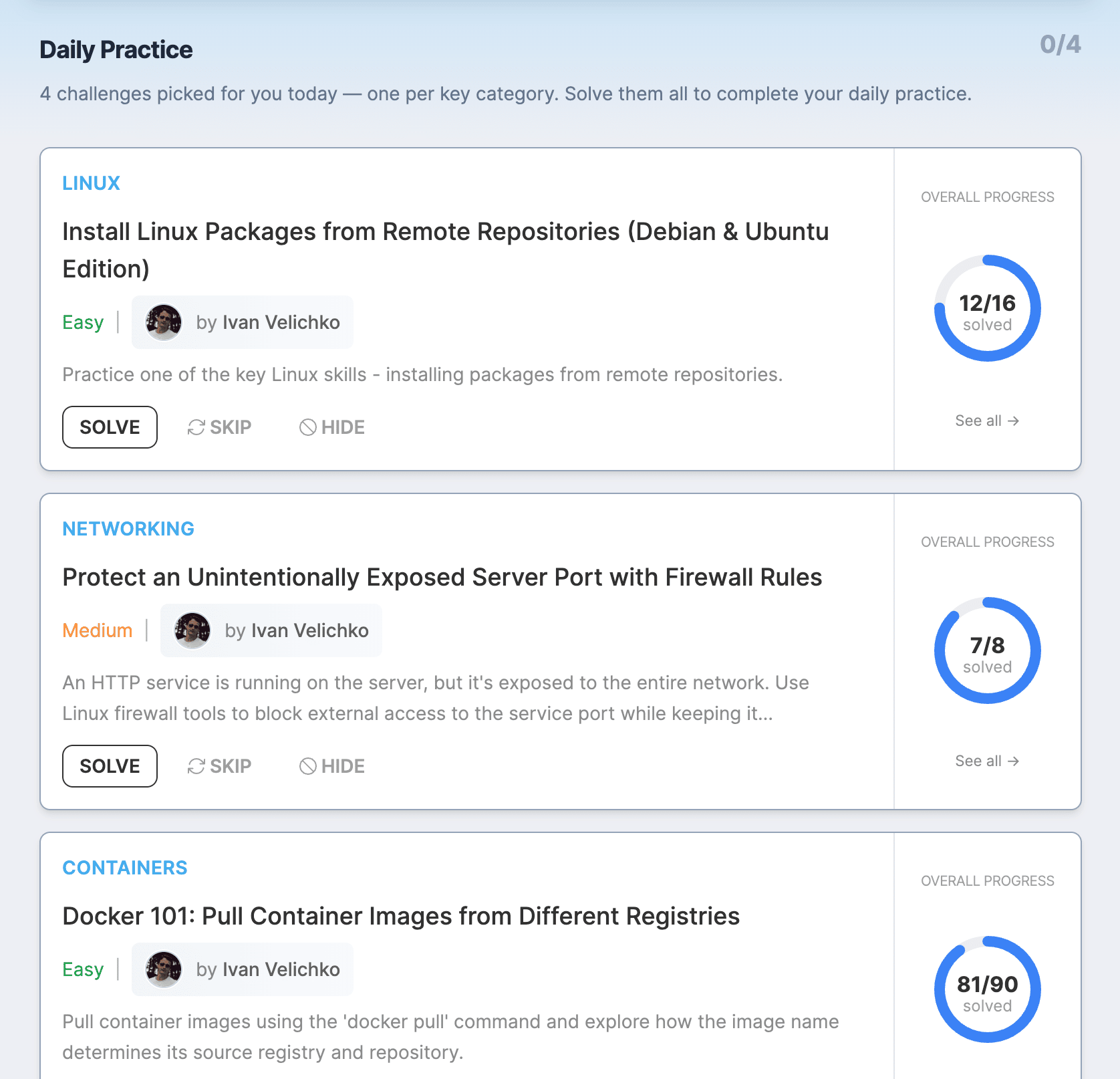 You'll start by building images from existing Dockerfiles, then gradually progress to writing simple Dockerfiles for Node.js, Go, and Python, installing system and application dependencies, compiling apps during the docker build process, optimizing images with multi-stage builds, supporting foreign CPU architectures, and finally producing production-ready images. The roadmap is heavily focused on learning by doing, but it also includes deep dives into image internals (the OCI Image Spec, visually explained) and the fundamental Linux capabilities behind container images, so the skills you'll get won't be superficial. And I left the best part to the end - to celebrate this important milestone, I'm making all materials of the second module free until May π But don't put it on the back burner - the materials will be free only for one month! New iximiuz Labs featuresMy main focus in April was on preparing new learning materials and supporting a couple of events during KubeCon (what a crazy week), but I also managed to ship a couple of features. Daily PracticeThe main dashboard got a new default tab that recommends up to 4 daily challenges - one per key category: Linux, Networking, Docker, and Kubernetes. I've already heard from several people that they really liked this addition, as it reduces the friction of picking your next exercise and also tricks you (in a good way) to play the Inbox Zero game and make all the doughnut charts green. And just a friendly reminder that solving a challenge permanently adds +5 minutes to your max daily usage time, and the first 10 solved challenges will reward you with a month of free Premium access π New Labctl IDE commandNo more bizarre A quick example: start a new Go development sandbox, clone a repo into it, and open your local VS Code pointed to that repo: