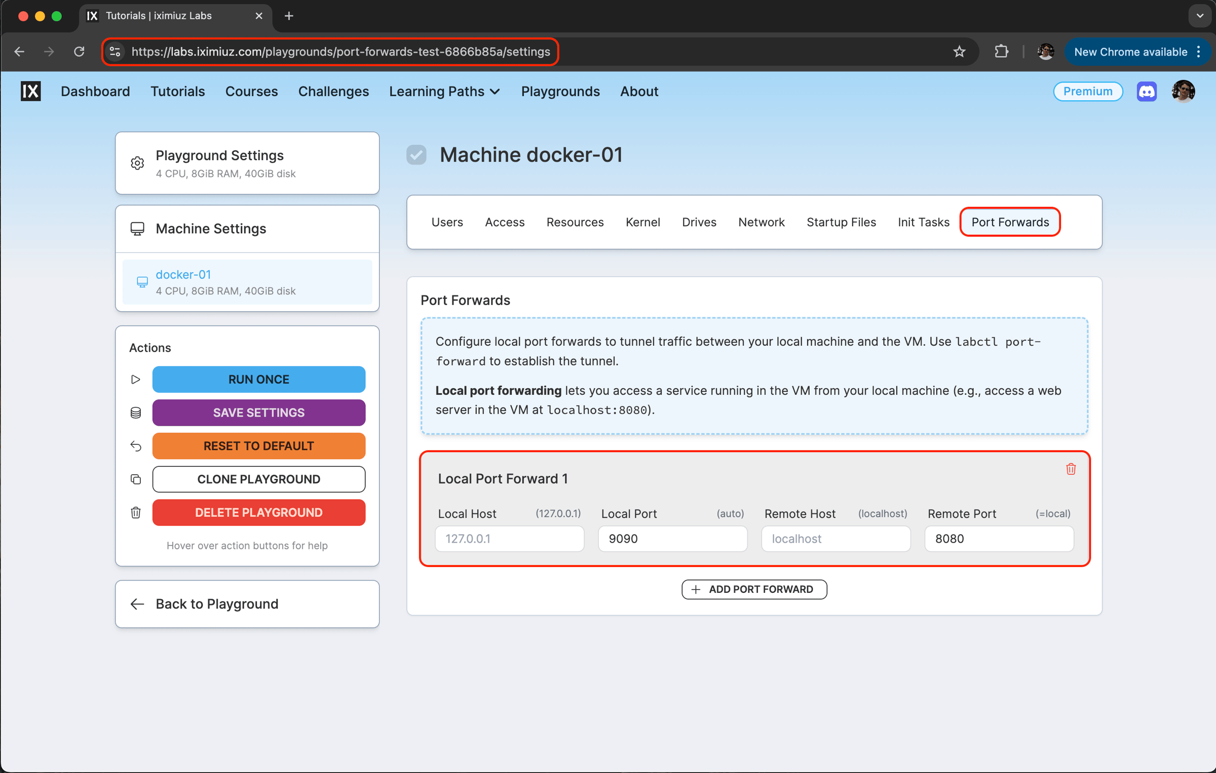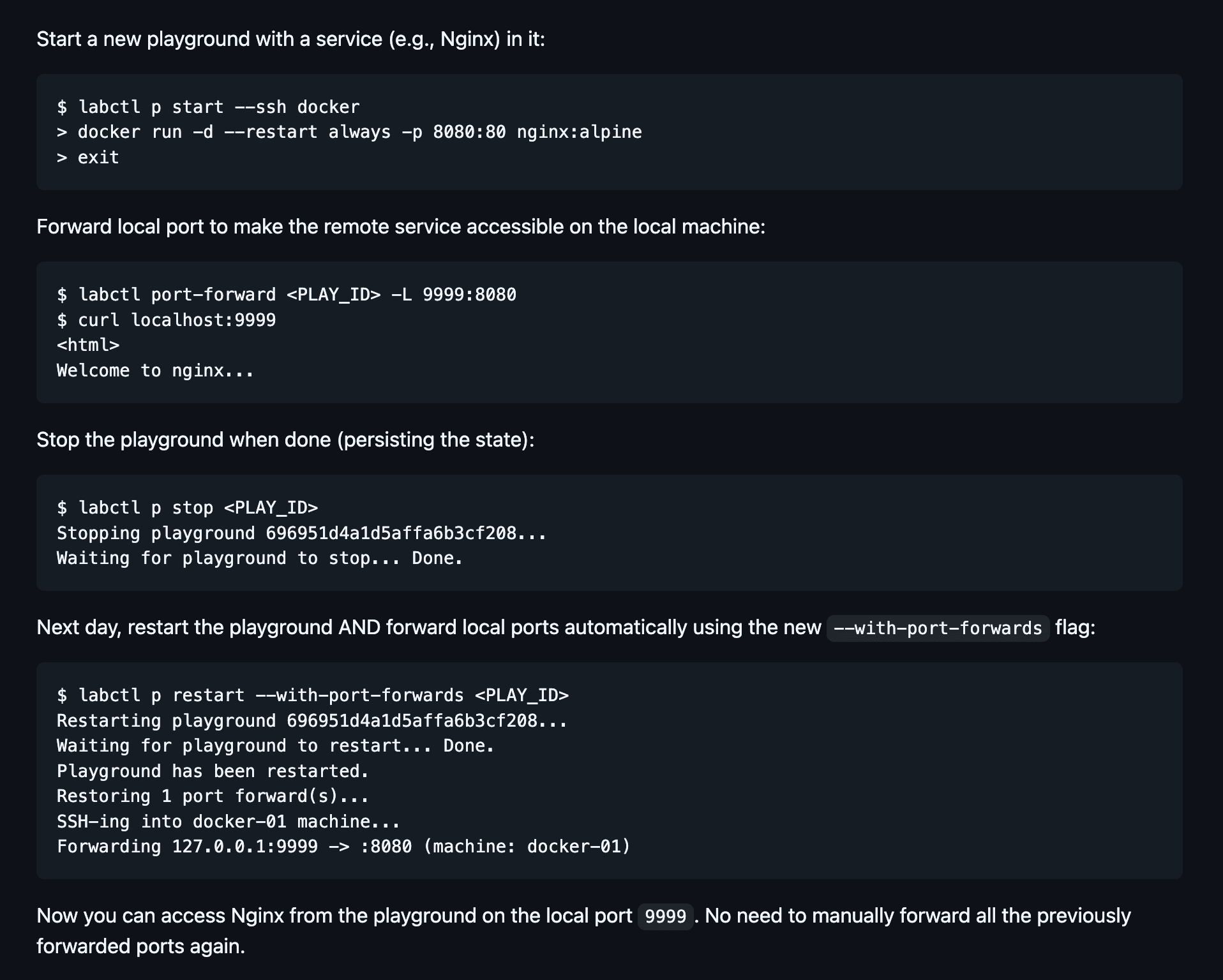 You can now auto-forward local ports, making services running in the playground available on the local machine right after a persistent playground restart: Additionally, it has also become possible to configure auto port forwards for new playgrounds. I.e., you can make a custom playground template, which, when started from the CLI, makes some services running in the playground available on local ports automatically via: